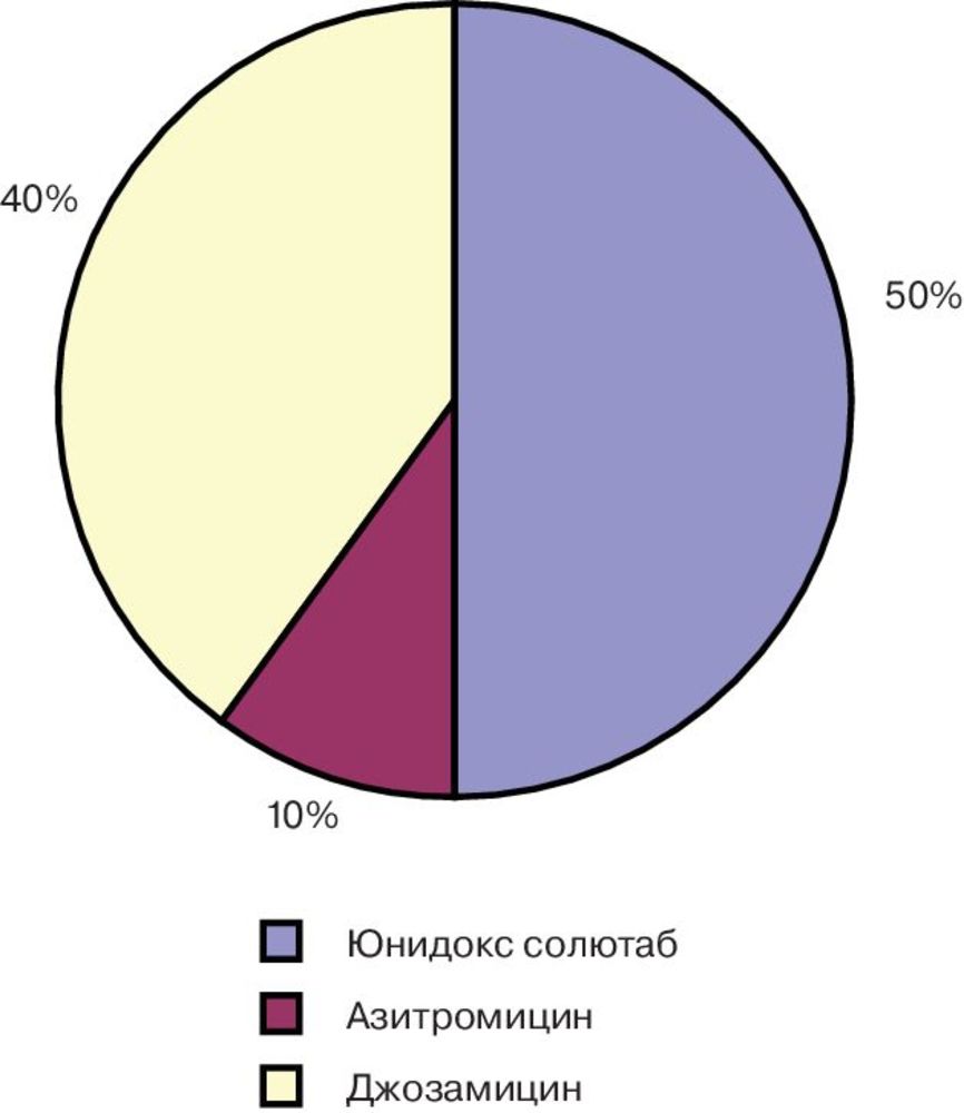 В 50% наблюдений использовался юнидокс солютаб, в 40% — джозамицин, в 10% — азитромицин, при этом имелись различия в продолжительности лечения от 7 до 14 сут (азитромицин 1,0 г однократно). В соответствии с научными представлениями, сформированными на базе принципов доказательной медицины, препаратами выбора для лечения хламидийной инфекции являются азитромицин (при неосложненной форме 1,0 г однократно или доксициклин по 100 мг 2 раза в сутки в течение 7 дней).