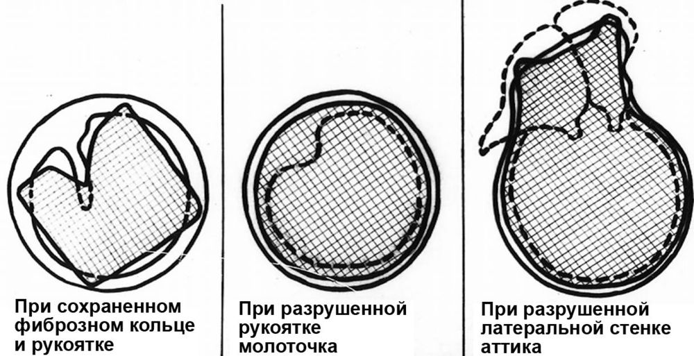 Пленку облекол применили у 30 больных от 15 до 52 лет (24 женщины и 6 мужчин) в качестве временного поддерживающего каркаса и наружной атравматичной повязки для тимпанального (аутофасциального) трансплантата. Пленку заготавливали непосредственно в процессе операции. Форма и способ ее укладки были индивидуальными и определялись, прежде всего, степенью сохранности фиброзного кольца, рукоятки молоточка, латеральной стенки аттика (рис. 1).