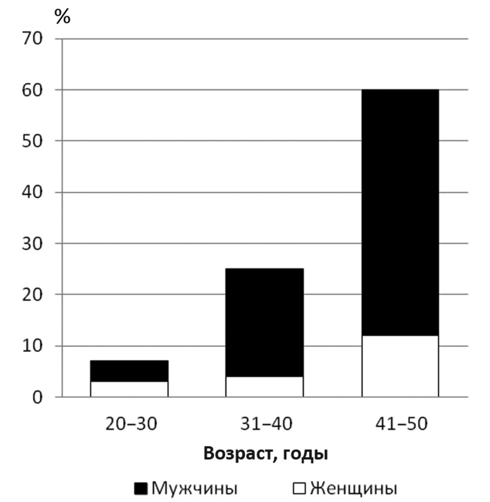 Обследовали 92 пациентов (19 женщин, 73 мужчины) в возрасте от 18 до 50 лет (средний возраст 42,2±6,7 года) с ИИ (основная группа), проходивших лечение в неврологических клиниках РНИМУ им. Н.И. Пирогова (ГКБ № 31, ГКБ № 20 Москвы).