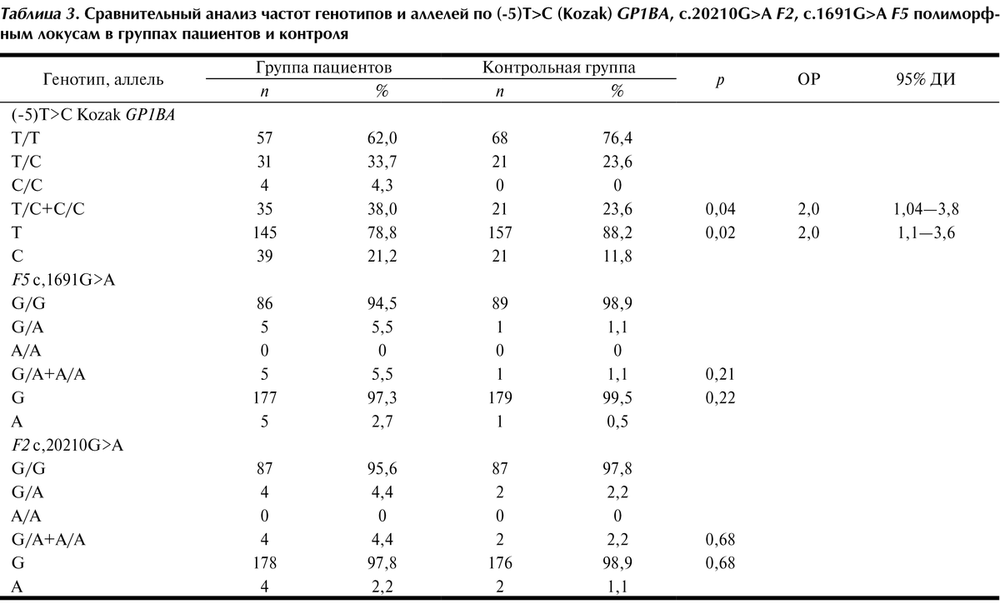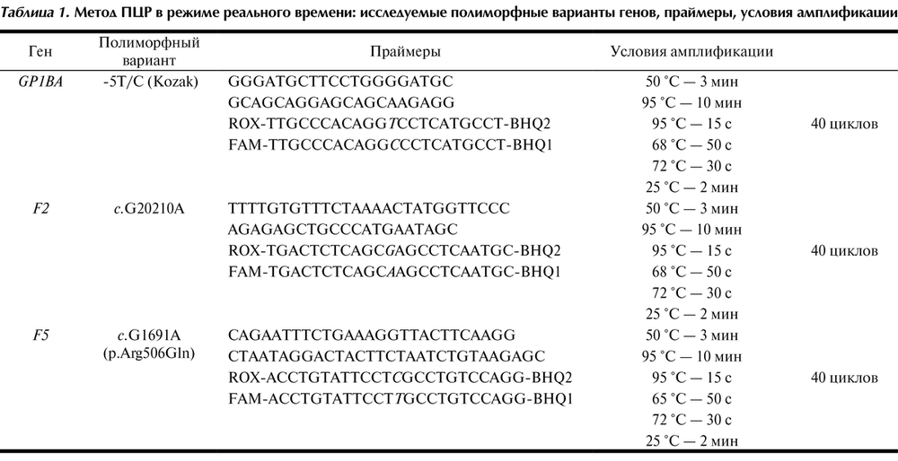 Полиморфные аллели генов GP1BA, F2, F5 исследовали методом полимеразной цепной реакции (ПЦР) в режиме реального времени с использованием технологии TaqMan (табл. 1).