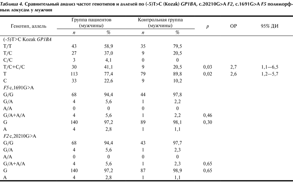 В нашем исследовании у женщин в возрасте от 18 до 50 лет также не было выявлено статистически значимой ассоциации с полиморфизмом -5Т/С гена GP1BA. Полученные данные могут свидетельствовать о том, что этот полиморфный локус играет роль в развитии ИИ у мужчин молодого возраста, принадлежащих к различным этническим группам.