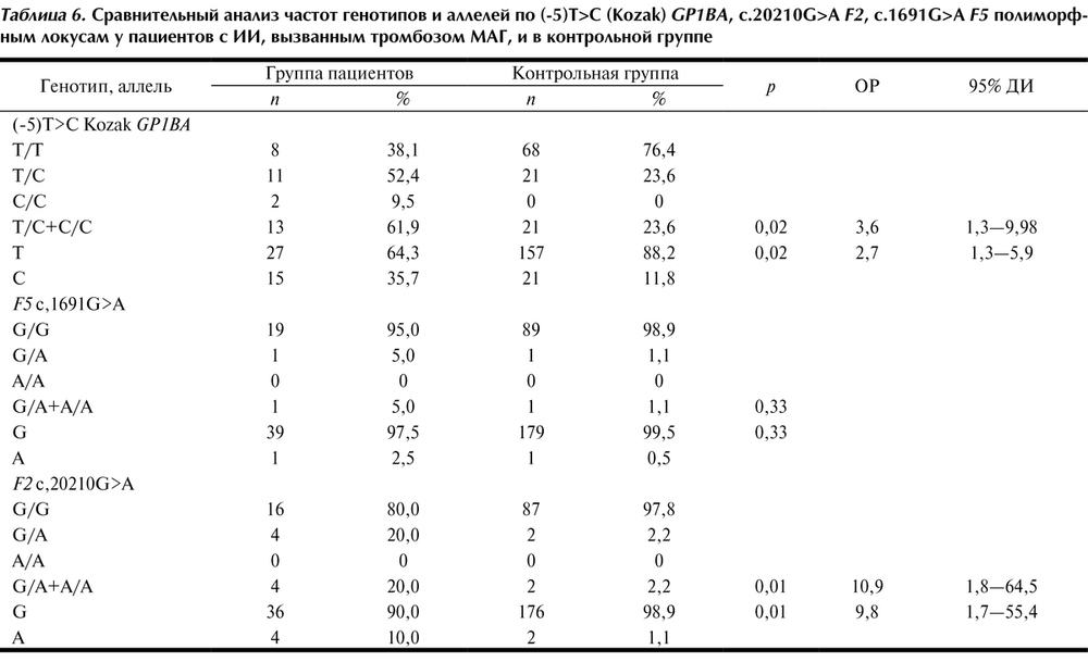 При анализе пациентов с лакунарным ИИ установлено наличие ассоциации полиморфизма -5Т/С гена GP1BA и полиморфизма G1691A гена F5 с данным вариантом ИИ (табл. 5).