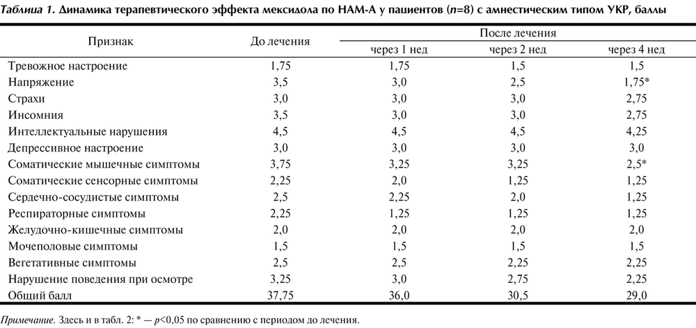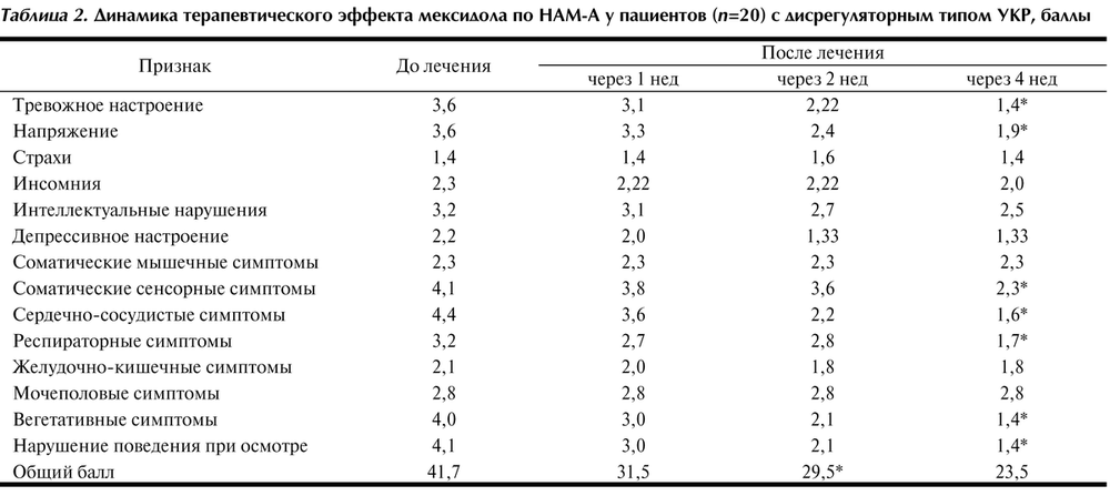 При применении мексидола положительный терапевтический эффект со снижением общегруппового показателя по суммарному баллу по шкале HAM-A был получен по выборке больных в целом. При этом переносимость терапии мексидолом была хорошей. К концу 1-й недели терапии наиболее выраженный эффект наблюдался у пациентов с дисрегуляторным типом УКР, в дальнейшем в этой группе больных скорость положительного эффекта опережала аналогичные показатели в двух других подгруппах УКР.