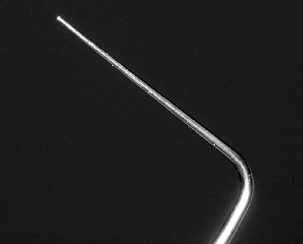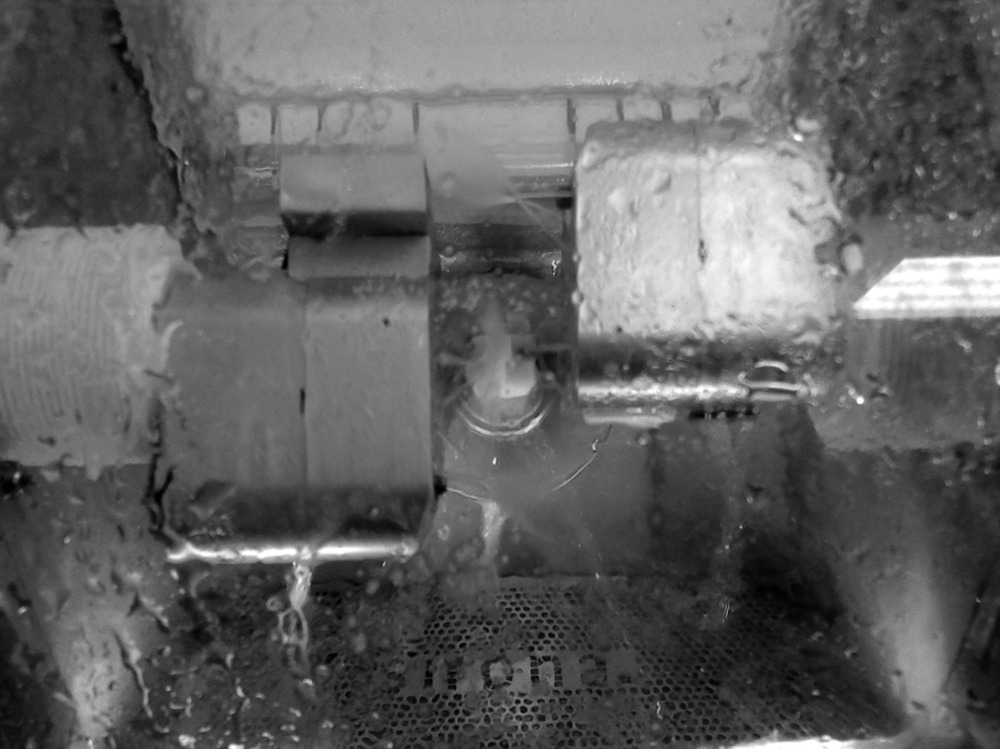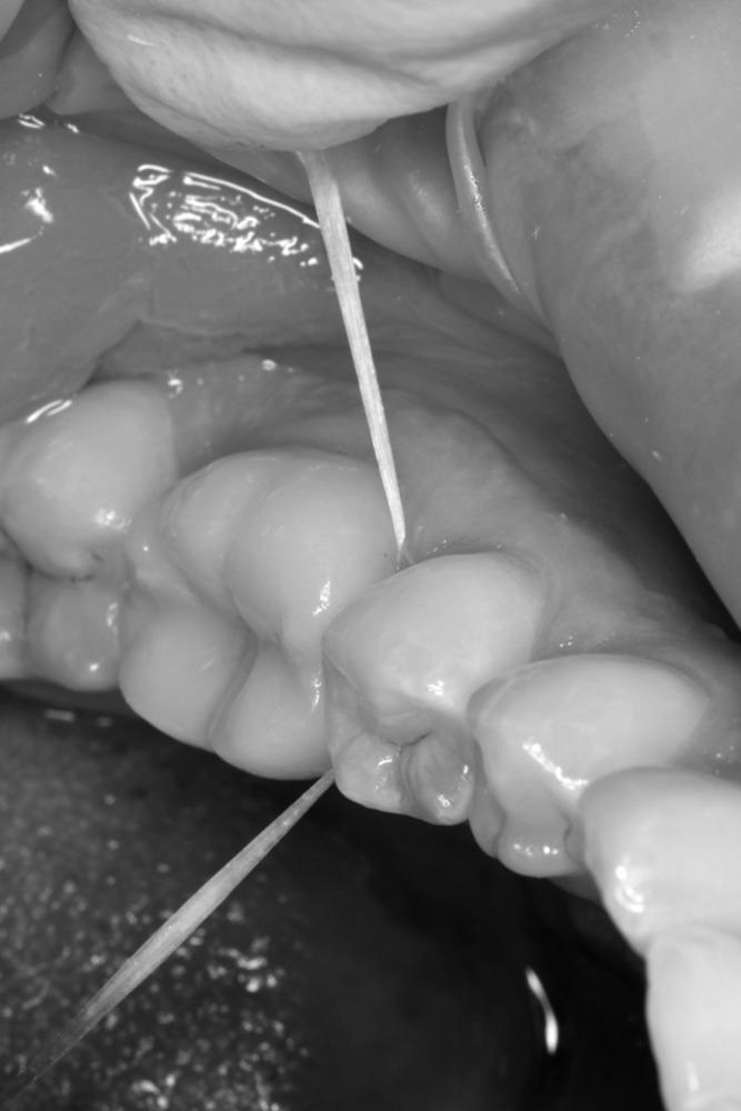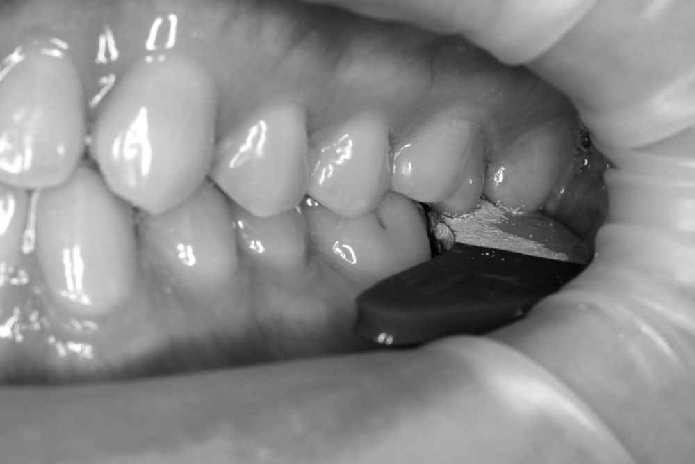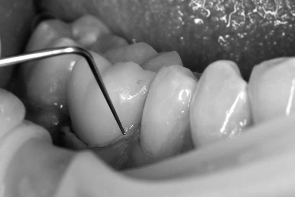 При оценке краевого прилегания коронки из полевошпатной керамики у 1 пациента из 2-й группы через 12 мес после фиксации была выявлена незначительная маргинальная щель менее 150 мкм, размер которой был проконтролирован специальным диагностическим зондом с толщиной рабочей части 150 мкм (рис. 5).
