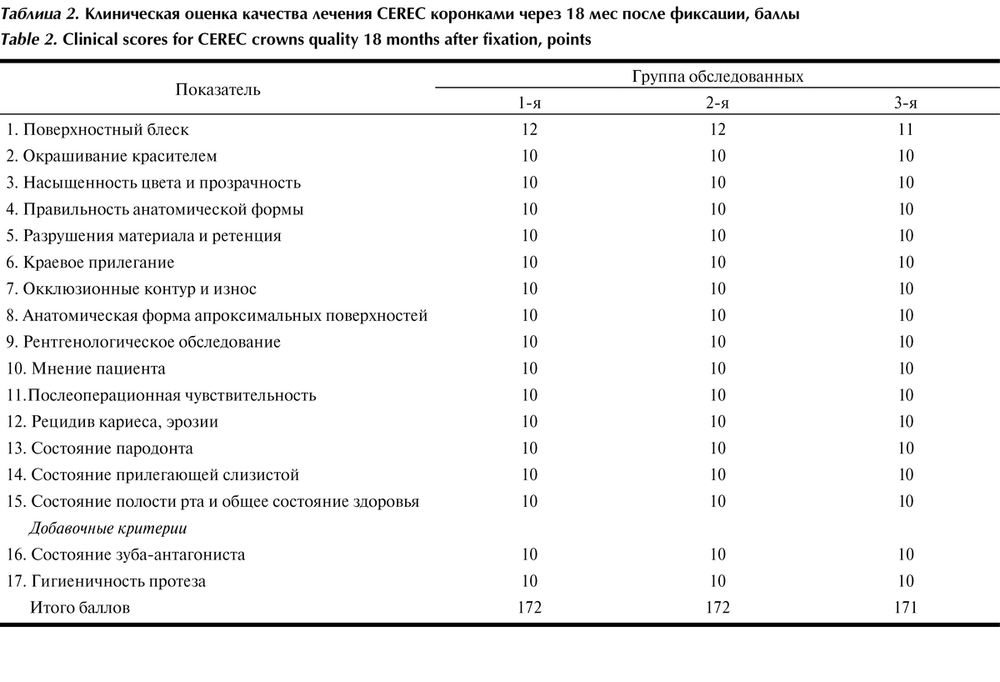 Для клинической оценки качества ортопедического лечения мы в своей работе применяли «Клинические критерии оценки прямых и непрямых реставраций», разработанные в 2007 г., которые включали клиническую оценку ряда эстетических, функциональных и биологических параметров [5] (табл. 1).